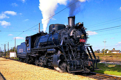 Frisco 2-10-0 puzzle, based on an original photo by Jack Bejna (photo copyright Jack Bejna -- used with permission). Photographed at Union, Illinois, October, 1985.