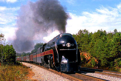 Norfolk & Western 4-8-4 puzzle, based on an original photo by Bob Krone (photo copyright Bob Krone -- used with permission). Photographed at Lula, Georgia, October 30, 1983.