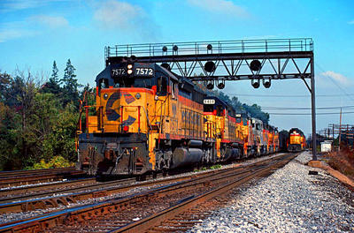 CSX Transportation (CSXT) SD40 puzzle, based on an original photo by Ted Grumbine (photo copyright Ted Grumbine -- used with permission). Photographed at Halethorpe, Maryland, October 17, 1987.