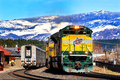 Union Pacific SD70ACe puzzle, based on an original photo by Jake Miille (photo copyright Jake Miille -- used with permission). Photographed at Truckee, California, April 26, 2019.