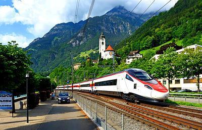 SBB RABe 503 puzzle, based on an original photo by Brian Stephenson (photo copyright Brian Stephenson -- used with permission). Photographed at Fluelen, Switzerland, June 3, 2018.