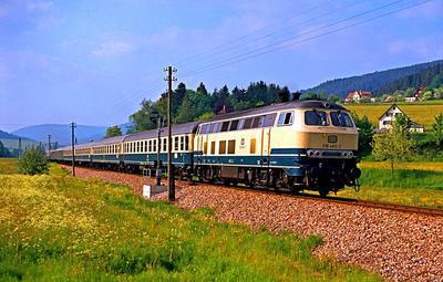 Deutsche Bundesbahn BR 218 puzzle, based on an original photo by Brian Stephenson (photo copyright Brian Stephenson -- used with permission). Photographed at Murgtalbahn, Germany, May 29, 1982.