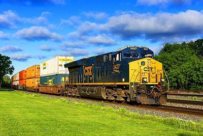 CSX Transportation (CSXT) ET44AH puzzle, based on an original photo by Rich Kaminsky (photo copyright Rich Kaminsky -- used with permission). Photographed at Berea, Ohio, May 31, 2020.