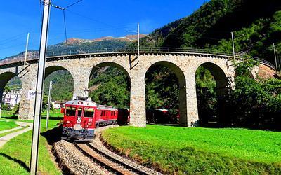 RhB - Rhätische Bahn ABe 4/4 puzzle, based on an original photo by Michael Sender (photo copyright Michael Sender -- used with permission). Photographed at Brusio Spiral Viaduct, Switzerland, September 28, 2021.