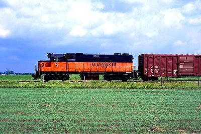 Milwaukee Road GP38-2 puzzle, based on an original photo by Greg Mross (photo copyright Greg Mross -- used with permission). Photographed at Sturtevant, Wisconsin, May, 1985.