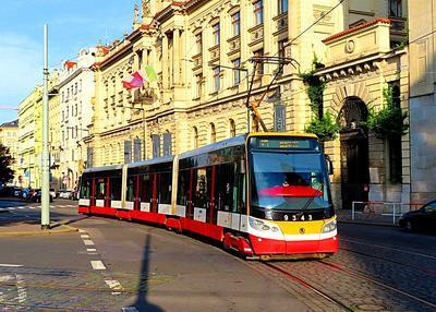 Czech Tram puzzle, based on an original photo by Bruno Dietliker (photo copyright Bruno Dietliker -- used with permission). Photographed at Prague, Czech Republic, September 8, 2019.