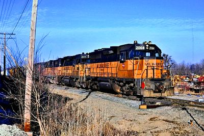 Milwaukee Road GP40 puzzle, based on an original photo by Greg Mross (photo copyright Greg Mross -- used with permission). Photographed at Duplainville, Wisconsin, September, 1988.