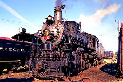 Frisco 2-10-0 puzzle, based on an original photo by Jack Bejna (photo copyright Jack Bejna -- used with permission). Photographed at Union, Illinois, October, 1985.