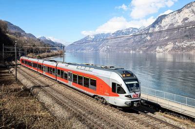 Südostbahn (SOB), Switzerland RABe 526 puzzle, based on an original photo by Georg Trüb (photo copyright Georg Trüb -- used with permission). Photographed at Murg, Switzerland, March 14, 2018.