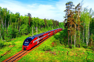 Russian Railways Stadler puzzle, based on an original photo by Ilya Semyonoff (photo copyright Ilya Semyonoff -- used with permission). Photographed at Domodedovo, Moscow Region, Russia, May 16, 2018.
