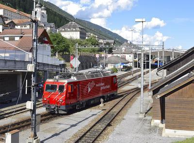 Matterhorn-Gotthard Bahn (MGB) HGe 4/4 II puzzle, based on an original photo by John Wiesmann (photo copyright John Wiesmann -- used with permission). Photographed at Disentis, Switzerland, August 8, 2019.