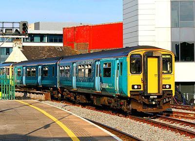 Arriva Trains Wales Class 150 puzzle, based on an original photo by Bob Pickering (photo copyright Bob Pickering -- used with permission). Photographed at Cardiff, United Kingdom, May 15, 2016.